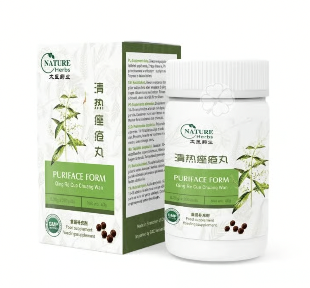 Composição: Chuan Xin Lian 19%, Zhi Zi 9%, Zhen Zhu Mu 3%, Da Huang 9%, Pu Gong Ying 13%, Niu Huang 1%, Gan Cao 8%, Jin Yin Hua 38%.